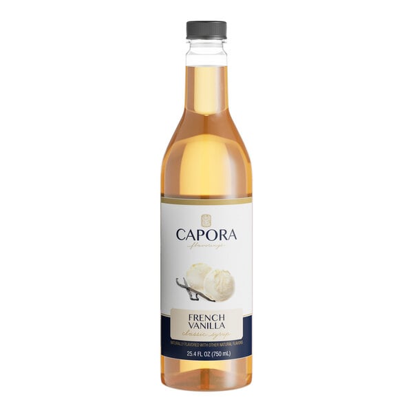Packaged in a unique bottle with a stylish design, this Capora French vanilla flavoring syrup has an attractive shelf presence that makes it a great addition to your restaurant, bar, coffee shop, or cafe. It can be paired with a compatible pump (sold separately) for quick, efficient service during peak serving hours. You can even store the bottle in one of the companion Capora racks (sold separately) to create an eye-catching display. This ready-to-use syrup mixes thoroughly and evenly with both hot and cold beverages.