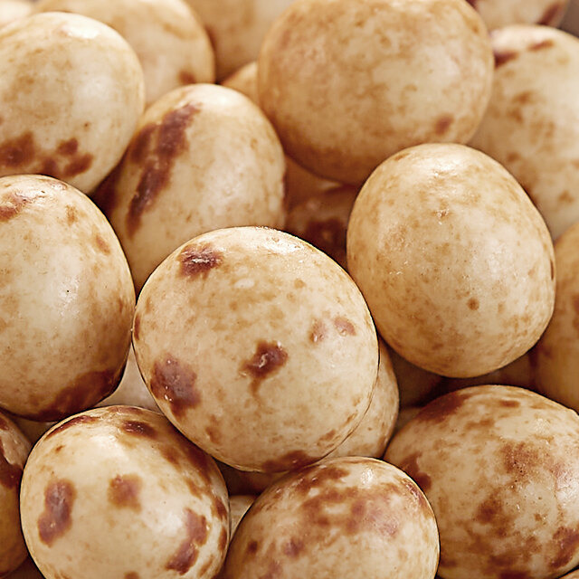 - Bold espresso beans enrobed in a marbled white and semi-sweet chocolate compound
