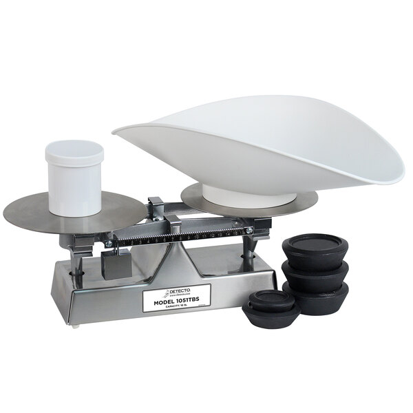 A quality baker's dough scale is a must-have in any bakery or restaurant that prides itself on its baked goods, and with this Cardinal Detecto 1051TBS 16 lb. baker's dough scale you get superior accuracy and dependability in one package! This scale features a hardened steel construction and 9" diameter plates that are sure to handle the rigors of a busy kitchen, and the beam is set to 16 oz. x 0.25 oz. graduations. An included counterweight set gives you everything you need for testing and calibration, and its USDA-Approved stainless steel exterior provides easy cleaning. It also comes with a white plastic scoop for added convenience.