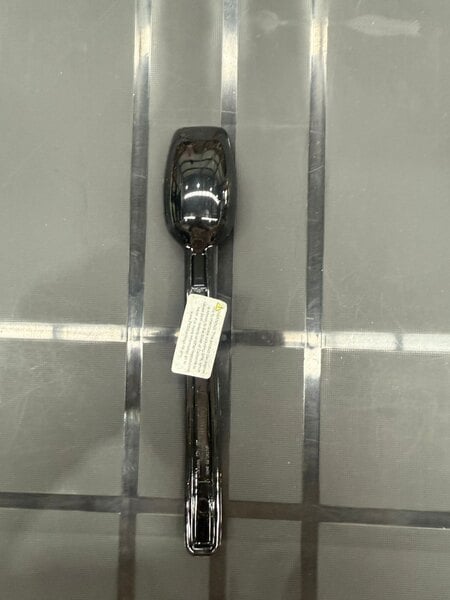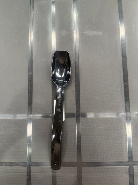 This Carlisle 446003 black salad bar / buffet spoon is perfect for serving delicious items at your food bar or buffet! The spoon's small to medium sized bowl has a 0.5 fl. oz. capacity and provides an ideal size for customers to serve themselves small portions from among a variety of buffet table dishes. Its long handle design makes reaching into or over food containers easy and helps prevent food contamination by ensuring that the entire spoon won't fall into containers.