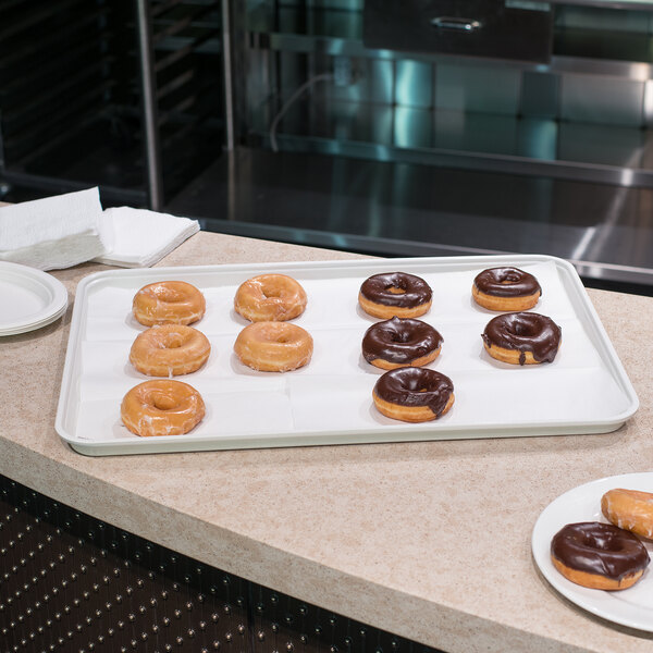 Engineered to be the most durable fiberglass tray available, this white Carlisle 2618FGQ001 18" x 26" Glasteel fiberglass display / bakery tray is ideal for everyday use at your bakery, deli, or other foodservice facility. It's formed around metal reinforcing rods to provide extra strength that prevent warping, and features two thick fiberglass core mats for added reinforcement and increased chemical resistance.