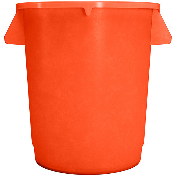 Ensure proper waste storage and removal in your facility with this Carlisle 84101024 Bronco 10 gallon orange trash can. Designed to outlast comparable waste containers, this heavy-duty trash can features an extra-thick polyethylene construction that stands up to daily use and has excellent resistance to acids, bases, and vegetable oils, making it a great bulk storage container. Its bottom boasts reinforced drag skids that prolong the life of the can, and molded-in notches that allow for a secure attachment to a compatible dolly. Additionally, the bottom has convenient handles that offer easy overhead lifting and controlled tilting to transfer contents into a dumpster.
