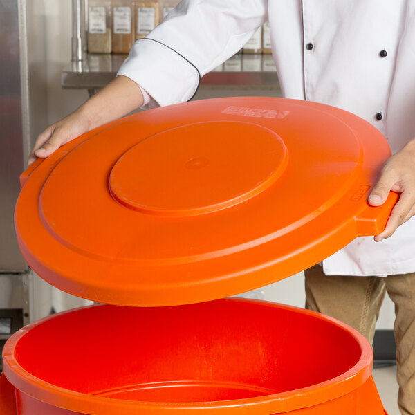Cover your waste container with this Carlisle 84103324 Bronco 32 gallon orange flat trash can lid. Designed to outlast comparable waste container lids, this heavy-duty lid features an extra-thick polyethylene construction that stands up to daily use and has excellent resistance to acids, bases, and vegetable oils, making it a great bulk storage container lid. Its snap down tabs lock with a simple press for a secure seal, and its pull release ensures simple removal from the container every time.