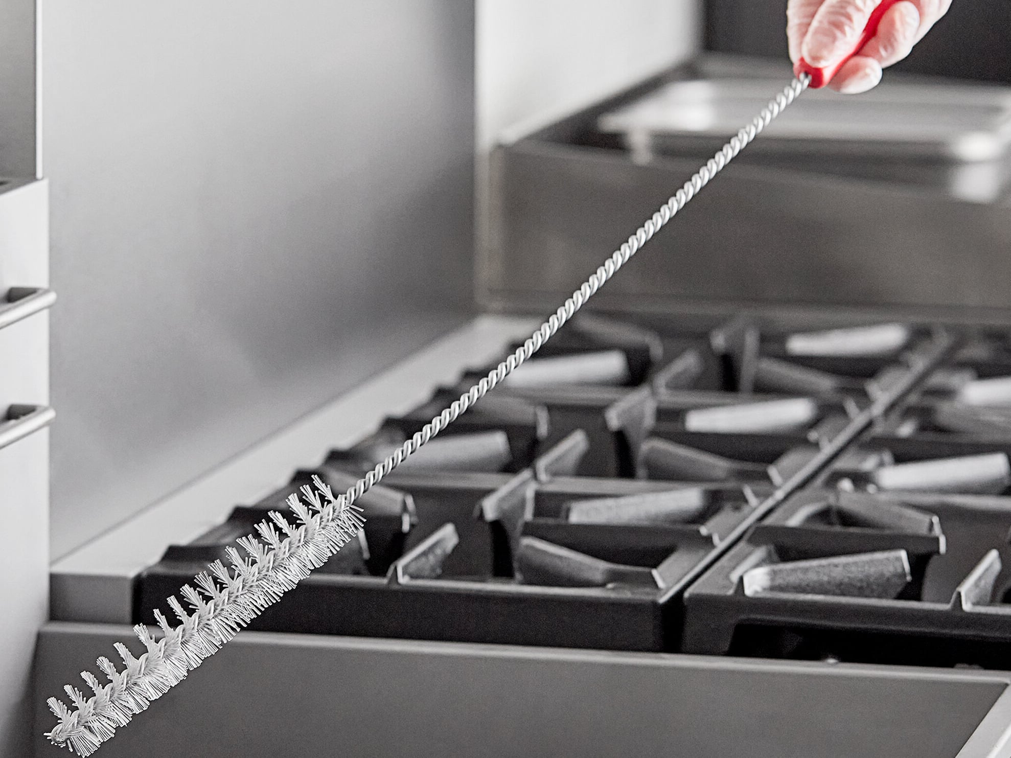 This brush's ample, 28" length allows you to keep your hands away from high temperatures while cleaning, and its straight design allows you to easily reach tight and narrow spaces. Not only are the durable bristles designed to out-perform comparable nylon, plastic, and natural boar bristles, they are also made to withstand temperatures up to 500 degrees Fahrenheit. The brush is also safe to use for cleaning your pots and pans.