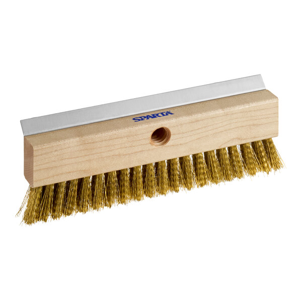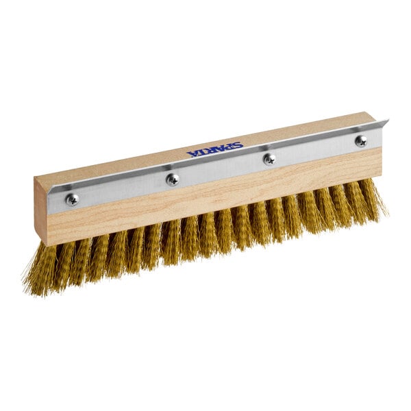 The head of this brush is made of sturdy wood to ensure that this brush will provide long-lasting use in your commercial establishment. The brass bristles are durable and rust-resistant, but are softer than stainless steel or carbon steel so they won't scratch your equipment. It's made to be used with compatible threaded wooden handles (sold separately). Whether you need to clean the pizza oven in your restaurant, bar, school, or, of course, your pizzeria, this grill cleaning brush will make it shine like new.