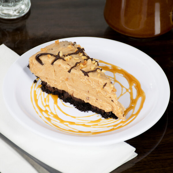 Designed with a reinforced rim and foot for durability, this reliable plate can handle temperatures of up to 212 degrees Fahrenheit! Use it to confidently serve your warmed desserts without worry of chips or breakage. This ensures a professional, clean appearance for every one of your customers.