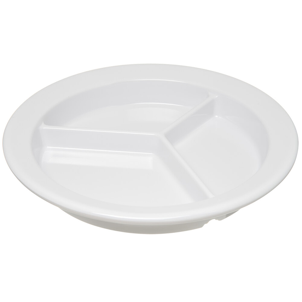 Carlisle Dallas Ware 9in white three-compartment melamine plate comes in a 24 case. Excellent for private catering events for banquet halls. Can use for everyday home use