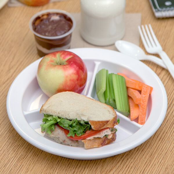 With a striking white color, this Carlisle 9" 3-compartment plate is ideal for serving an entree with two separate sides with confidence! With a durable construction, this plate is great for buffets, restaurants, and catered events. The white coloring draws attention to the presentation and provides a sophisticated background.