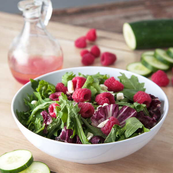 The Carlisle 4381302 Epicure 1.25 Qt. White Melamine Bowl is great for salads, cereal, pastas and more. They hold up to high usage and have not stained at all.