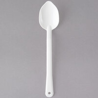 This serving spoon features a curved handle to rest conveniently on the edge of a food pan. Thanks to a one-piece polycarbonate construction, it can withstand wet temperatures up to 212 degrees Fahrenheit (dry heat up to 270 degrees Fahrenheit). This makes it suitable for use serving cold or hot dishes.