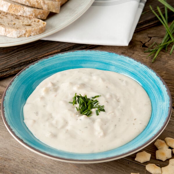 The swirl design creates movement and interest, drawing your eye toward the center of the bowl, while its aqua color accents the rest of your table setting. This bowl also incorporates an embossed texture, tapered rim, and a darkened edge that enhances the appearance of your soups, stews, and chowders.