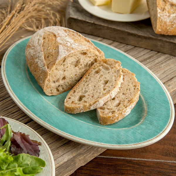 Use this Carlisle 6402015 Grove 12" x 8" aqua oval melamine platter to direct all eyes to your perfectly plated appetizers or large entrees.