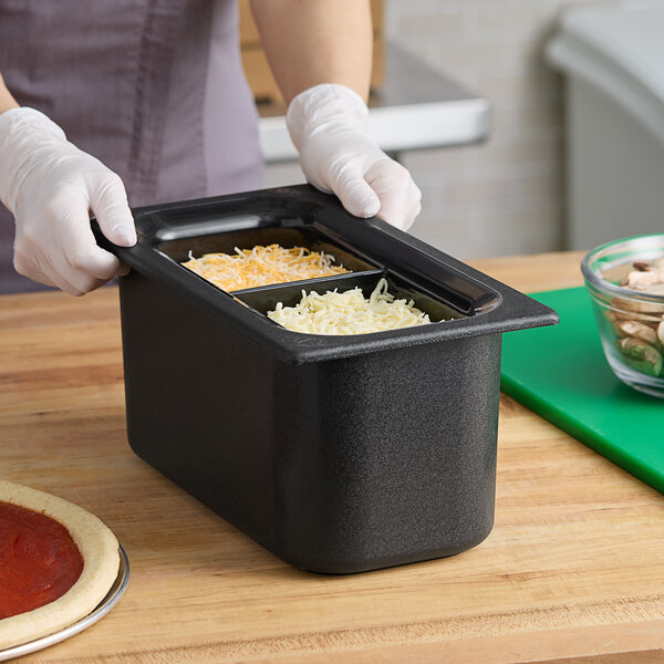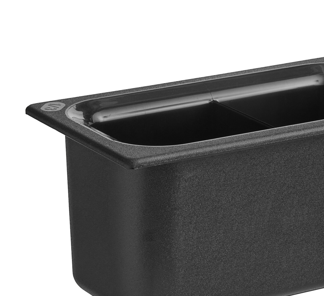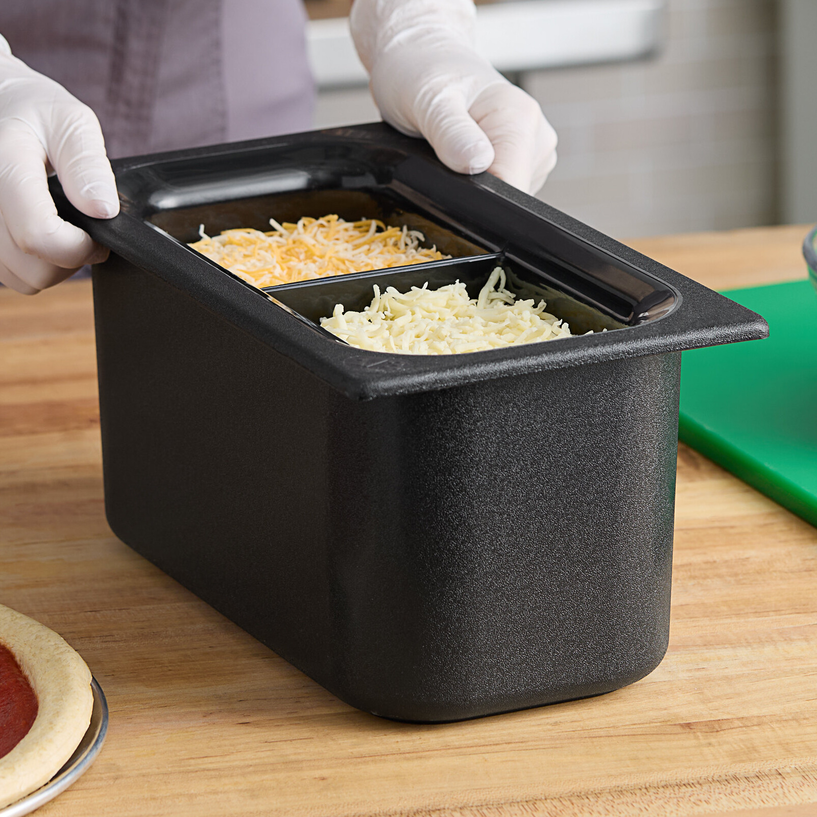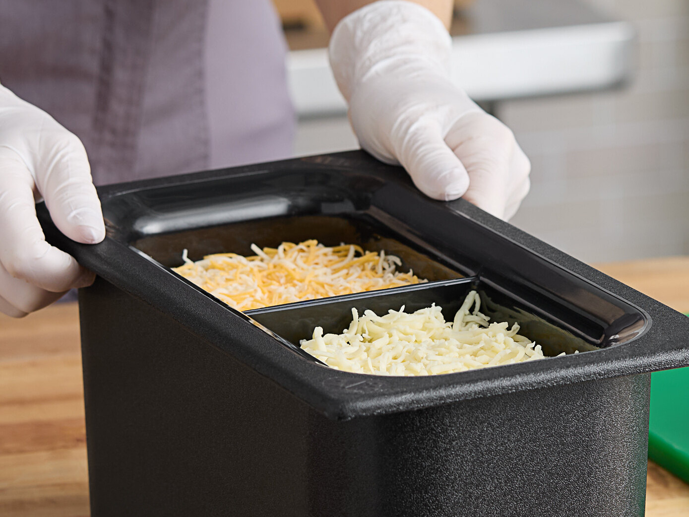 This cold food pan fits in the footprint of a 1/3 size pan but has two separate compartments. With this pan, you can keep two different foods cold with just one pan!