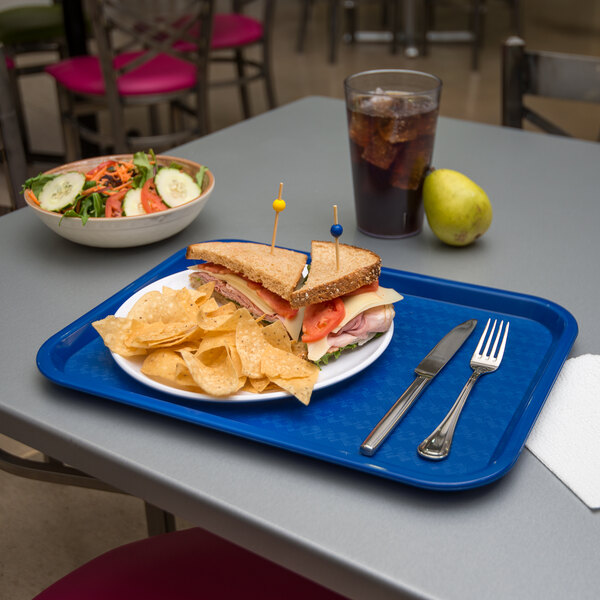 This lightweight tray is ideal for use at your cafeteria, concession stand, snack bar, or quick-service restaurant. Its rectangular shape and 12" x 16" surface make it perfect for holding multiple food items with ease. The attractive blue color fits in with any decor, or mix and match with other colors from this collection for a dynamic display.