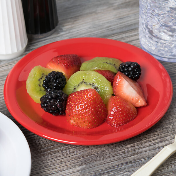 Made from shatter- and break-resistant melamine, this plate promotes a safe work environment in your high-volume restaurant, bar, cafeteria, or outdoor venue. Plus, with the added benefit of quick and easy cleanup, your staff can maximize their productivity at the end of meal service to efficiently clean the kitchen and dining area.