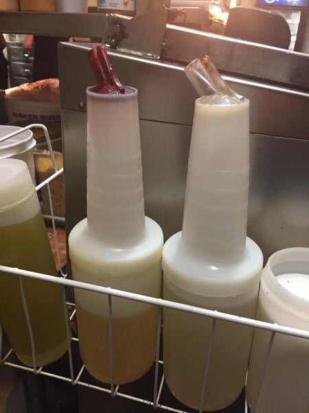 We use these for our sour mix at each bar station. We couldn't live without these on margarita night. We keep them ready in the cooler with the caps on and then switch the pour neck over when we run out. Very quick and convenient.