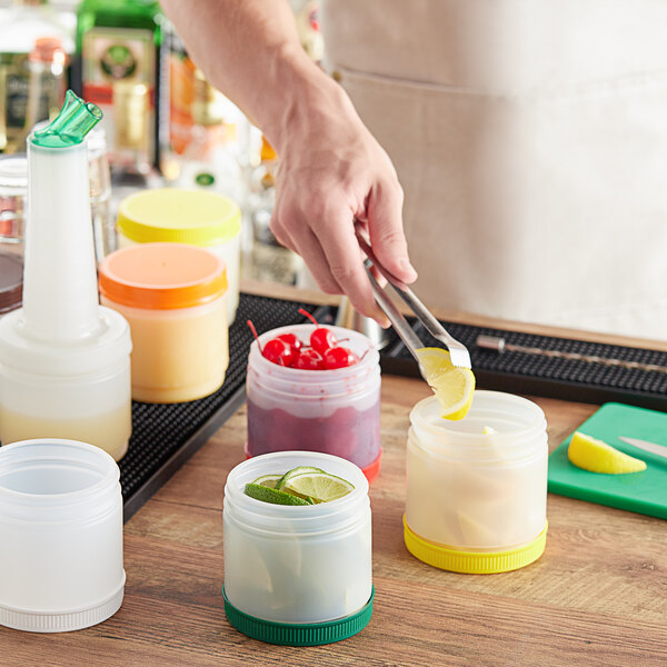 These Carlisle PS502N00 Store N' Pour® 1 pint / 16 oz. containers with assorted color caps will simplify how you store condiments at your busy bar or restaurant! Made of high density, break-resistant polyethylene, these containers boast straight walls with no sharp interior edges, ensuring they won't collect food particles or harbor bacteria, and can be used to store anything from sauces and dips to cherries and olives. Plus, the included caps create an airtight, leak-proof seal for sanitary storage. The caps also have a unique ridge design so you can store jars on top of each other to maximize storage space.