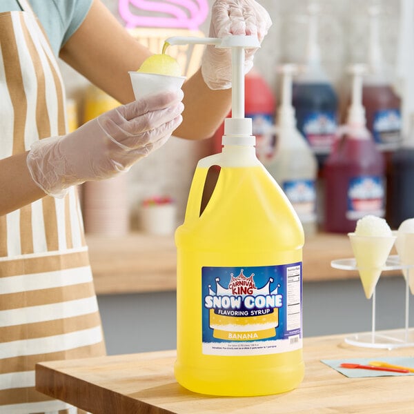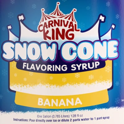Carnival King’s 1 Gallon Banana Snow Cone Syrup is a vibrant, cost-effective choice for creating refreshing treats at fairs, ice cream shops, or events. Its sweet banana flavor and bright yellow color enhance the taste and appearance of snow cones and snowballs, delivering a fun, nostalgic experience.