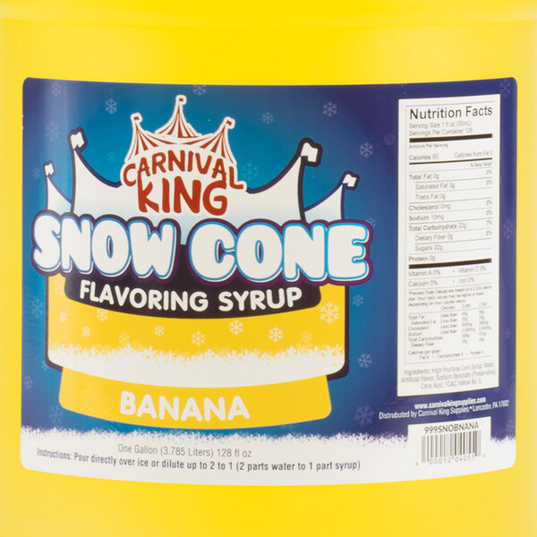 Colorful and flavorful snow cones are sure to draw customers to your concession stand or carnival cart. Keep up with the demand for these refreshing frozen treats with this Carnival King 1 gallon banana snow cone syrup! With the large amount of servings per container, your venue will be in good supply. Simply pair it with a compatible pump for fast, efficient service.