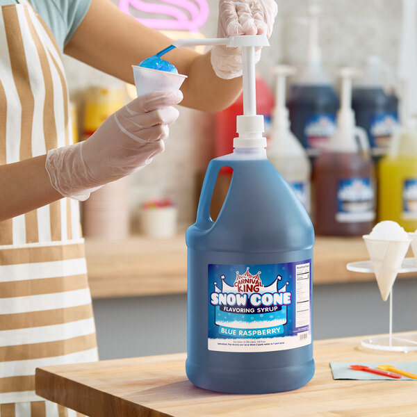 Colorful and flavorful snow cones are sure to draw customers to your concession stand or carnival cart. Keep up with the demand for these refreshing frozen treats with this Carnival King 1 gallon blue raspberry snow cone syrup! With the large amount of servings per container, your venue will be in good supply. Simply pair it with a compatible pump for fast, efficient service. Perfect for ice cream shops, fairs, stadiums, or other special events, this Carnival King snow cone syrup helps you quickly and easily prepare your customers' favorite cold summertime treats at an affordable price!