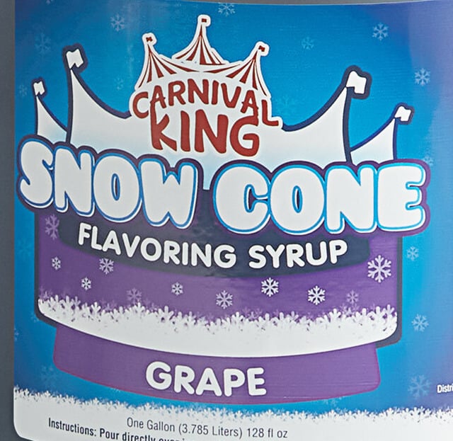 Colorful and flavorful snow cones are sure to draw customers to your concession stand or carnival cart. Keep up with the demand for these refreshing frozen treats with this Carnival King 1 gallon grape snow cone syrup! With the large amount of servings per container, your venue will be in good supply.