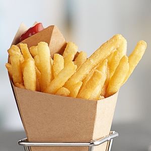 This fry cone features a natural kraft color for a sophisticated presentation of your signature sides, desserts, or appetizers. For added versatility, it can also be used in a compatible cone-shaped wire basket (sold separately).