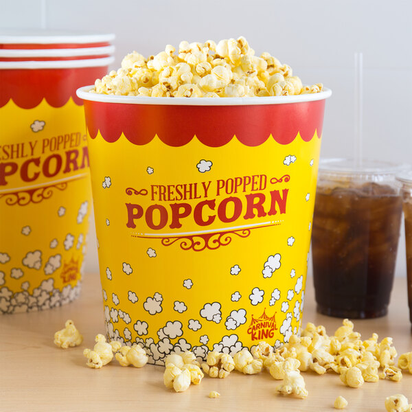 We purchased a commercial popcorn machine and cart from the Webstaurant store because we are popcorn fanatics. I have large neighborhood gatherings weekly and needed popcorn buckets would serve a crowd. These 85 oz buckets are perfect and everyone feels like they are at the theater having popcorn. These are sturdy and hold a large amount of popcorn and they are a great buy.