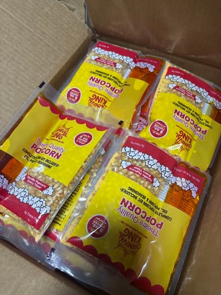 Carnival King is the brand to trust for your concession supplies, and this complete popcorn kit includes everything you need to pop golden, delicious-tasting popcorn. Popcorn is a crowd pleaser that's easy to make and will help boost impulse sales at your venue. Containing kernels, seasoning salt, and popping oil, this kit helps you produce consistently buttery batches of fresh popcorn.