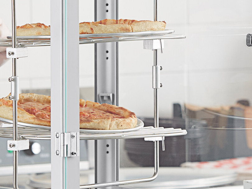 This product works well. Our school really liked that it came with shelves. These worked well for soft pretzels that would often break on the carousel rotator. The warmer gets decently warm, but I wouldn't plan on warming any pretzels from cold or frozen. This warmer should be used only to keep pretzels warm after baking.