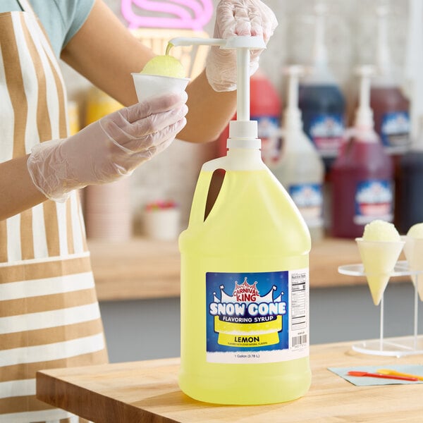 Colorful and flavorful snow cones are sure to draw customers to your concession stand or carnival cart. Keep up with the demand for these refreshing frozen treats with this Carnival King 1 gallon lemon snow cone syrup! Carnival King offers great flavors at a great value, and this sweet lemon flavor enhances the appearance, color, and taste of your shaved ice desserts. Besides traditional snow cones, you can use this syrup with ice and a scoop of marshmallow topping to create a classic snowball.