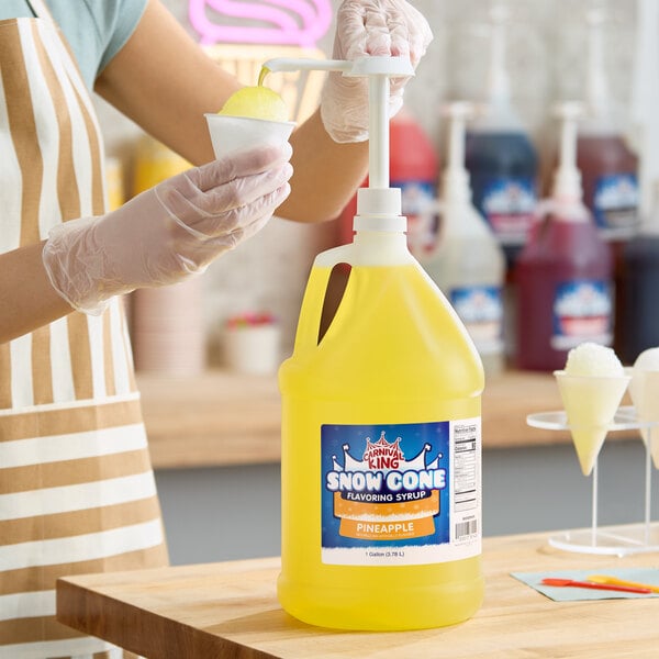 Colorful and flavorful snow cones are sure to draw customers to your concession stand or carnival cart. Keep up with the demand for these refreshing frozen treats with this Carnival King 1 gallon pineapple snow cone syrup! Carnival King offers great flavors at a great value, and this sweet pineapple flavor enhances the appearance, color, and taste of your shaved ice desserts. Besides traditional snow cones, you can use this syrup with ice and a scoop of marshmallow topping to create a classic snowball.
