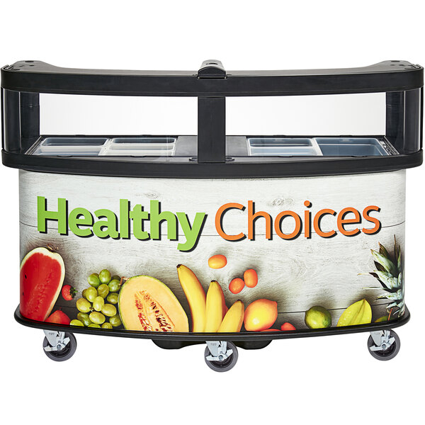 Cambro CVC75W14 Black Customizable Polyethylene Open Well Vending Cart with "Healthy Choices" Laminated Wrap and Sneeze Guard - 75 1/8" x 33 1/2" x 53 1/8"