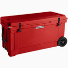 To ensure ease of use, the cooler features a rope handle on each end, making it comfortable to carry and transport. The exterior also includes indentations, while the rubber latches boast finger indentations for superior ergonomics. Rubber 6" diameter wheels even make the cooler easy to roll, saving your employees from having to lift heavy loads.