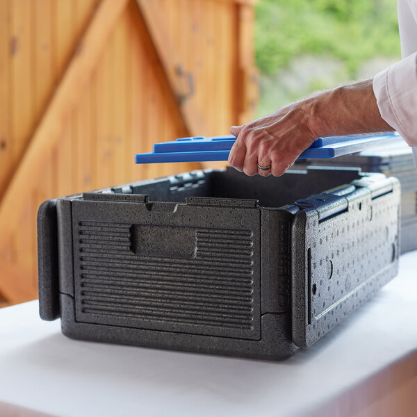 Effortlessly transport cold food to your next catered event with this CaterGator Dash black full size 8" deep flip down top loader EPP insulated food pan carrier with companion blue full size ice board!