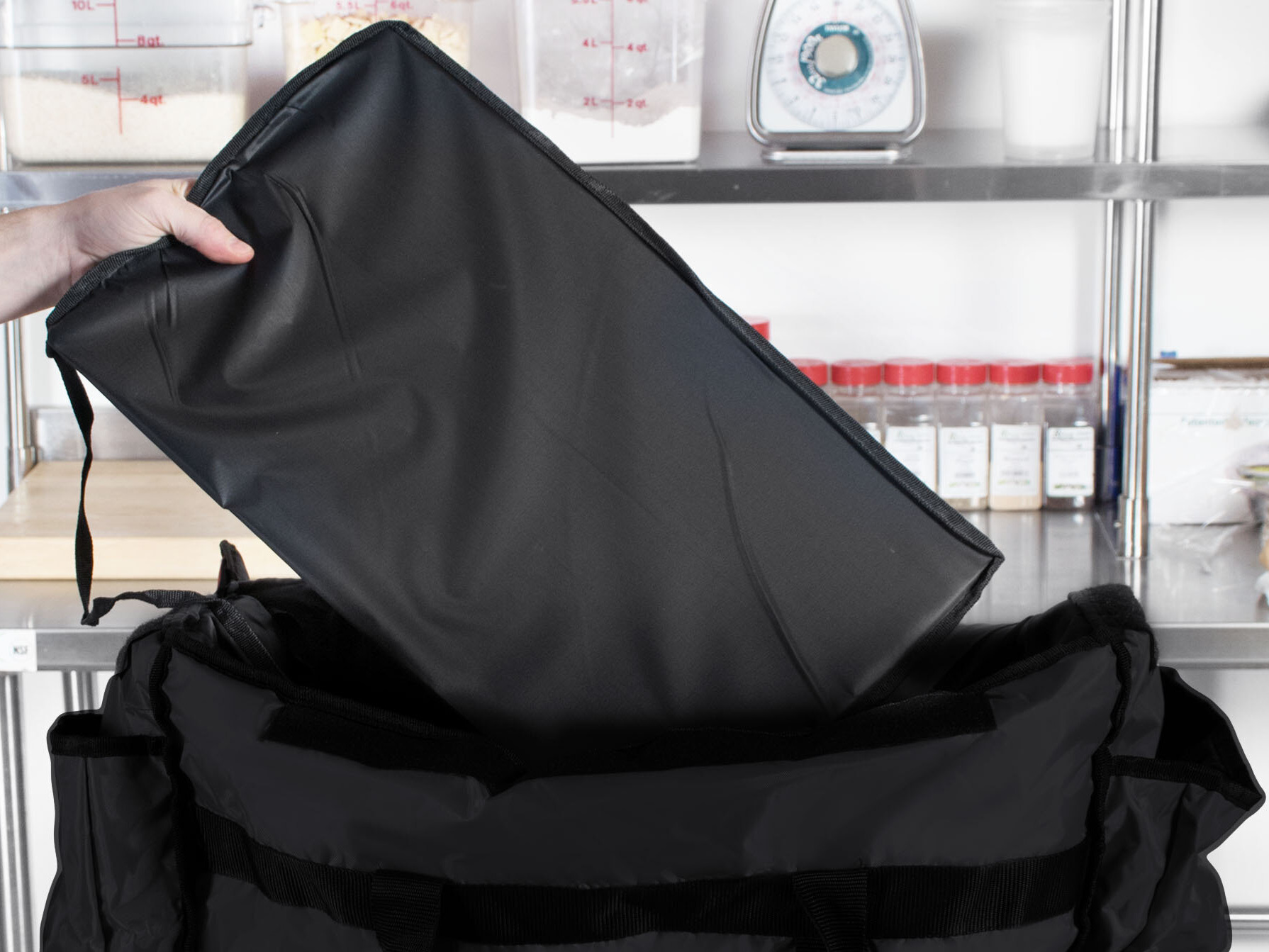 I had been searching for a quality food delivery bag forever when I came across WebstaurantStore and ServIt. These guys have quality products, so I'm happy I found them! I do UberEats, so I needed something that would hold up to the grind, and this bag sure does it for me! First off, the velcro makes everything faster to access, and it's super durable, so no chance of it flying open. The exterior pockets are definitely large enough for 2 liter bottles, and there's even a windowed slot for your receipts. The hardboard bottom is a plus, as it will prevent your containers from collapsing on top of one another during transport. There's also a nice sized pocket on the inside lid area for your heat/cold packs. The bag is larger than I expected, but I'm glad, because I have enough room for my 424DRINK3BG ServIt small drink bag plus to-go containers. Oh, and they even added reflective stripes for your safety! The only thing I wish it had was a shoulder strap, but other than that it's a great bag!