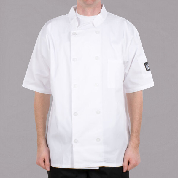 This is a classy chef's coat great for the restaurant and home occasionally, short sleeves make it comfortable to work in the kitchen and it has a pocket for pen and thermometer . Affordable and shipped promptly by webstaurant store