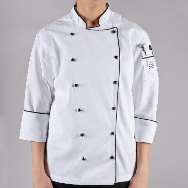 The size M Chef Revival Gold Chef-Tex LJ044 ladies white customizable executive jacket with black piping is an ideal combination of comfort, performance, and elegance. The drop shoulder and yoke construction, tailored fit, and side vents help add sophistication to this distinctive design. A thermometer and pen pocket is added for practicality.