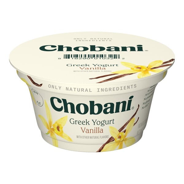Balance deliciousness and nutritiousness with this Chobani non-fat vanilla Greek yogurt. Your customers will adore this thick, velvety Greek yogurt because it has a sweet, tangy, and vanilla-forward flavor profile. It is made with cultured non-fat milk for an appetizing, authentic Greek yogurt taste. Watch your customers smile and enjoy this mouthwatering product. It is a sweet and healthy addition to restaurants, grab-and-go buffets, and cafeterias!