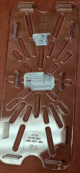 Nice little tray. Fits perfect in poly 1/6 pans. Good for topping like diced tomatoes so they dont sit in there juices. Only bad thing is the "choice" labels leave a sticky residue that is very difficult to remove.