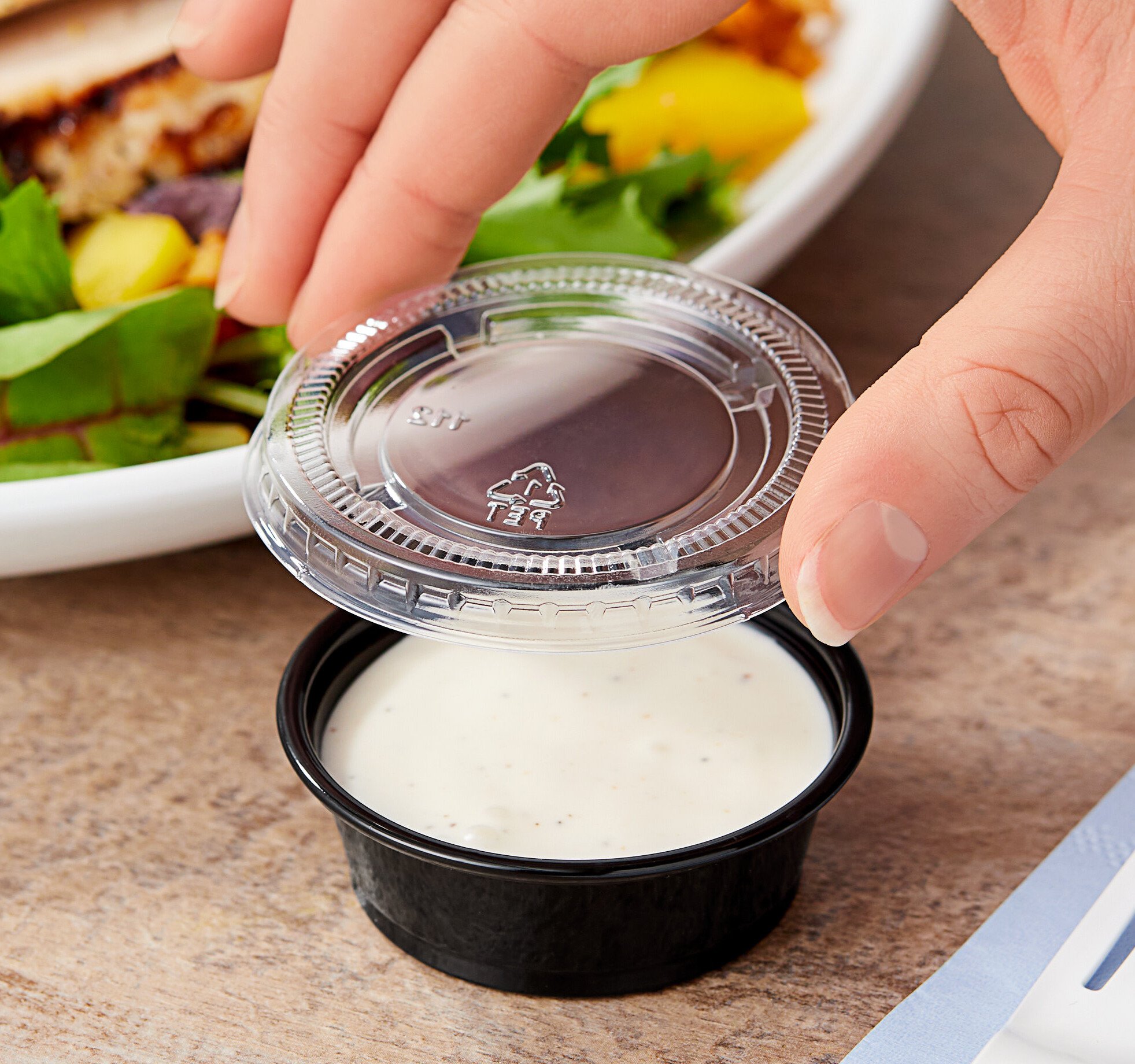 Great for condiments, sauces, and sides, this cup-and-lid combo boasts a versatile range of uses to accommodate in-house applications as well as take-out services. Skip the search for compatible lids by using the Choice souffle cup with a lid included! Try this Choice souffle cup and PET plastic lid in your restaurant, buffet, or catered event to add convenience and efficiency to your service.