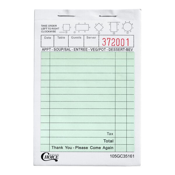 Give your staff the tools necessary for them to collect and bill orders quickly and accurately with this Choice 1 part green and white guest check! It features everything your staff needs to increase productivity and overall customer satisfaction. Plus, since each sheet is bound into a pad of 100, you’ll never have to worry about loose sheets or mixed up orders, again.