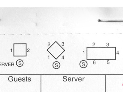 Table diagrams at the top of each order sheet enhance order accuracy. Each patron is assigned a placement at the table that corresponds with a row on the order pad.