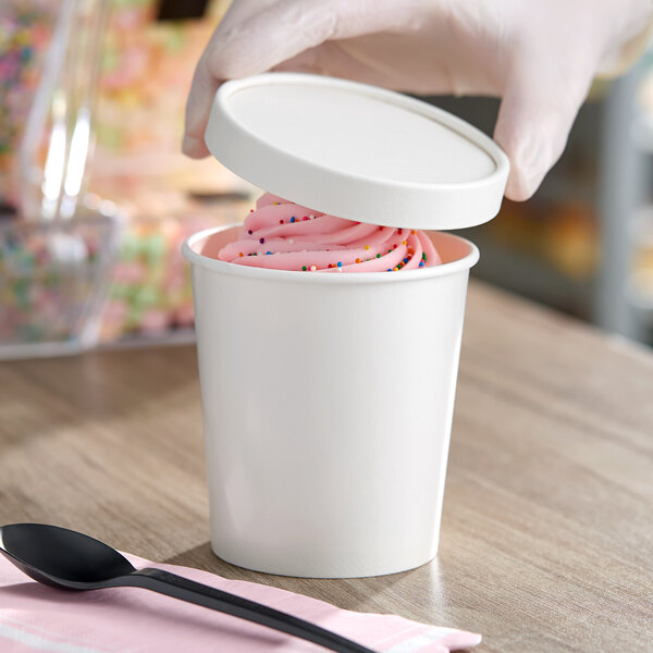 Perfect for ice cream shops, concession stands, diners, and bakeries, this 1 pint ice cream container/lid combo helps make take-out orders easier than ever before. The container's double-coated design provides outstanding insulation that keeps your cold and frozen treats ready for consumption at any time or place. Plus, it can be used for more than just ice cream. Easily pair it with mixed fruit, yogurt parfaits, puddings, and more! No matter the contents inside, this versatile cup will instantly enhance your serving capabilities.