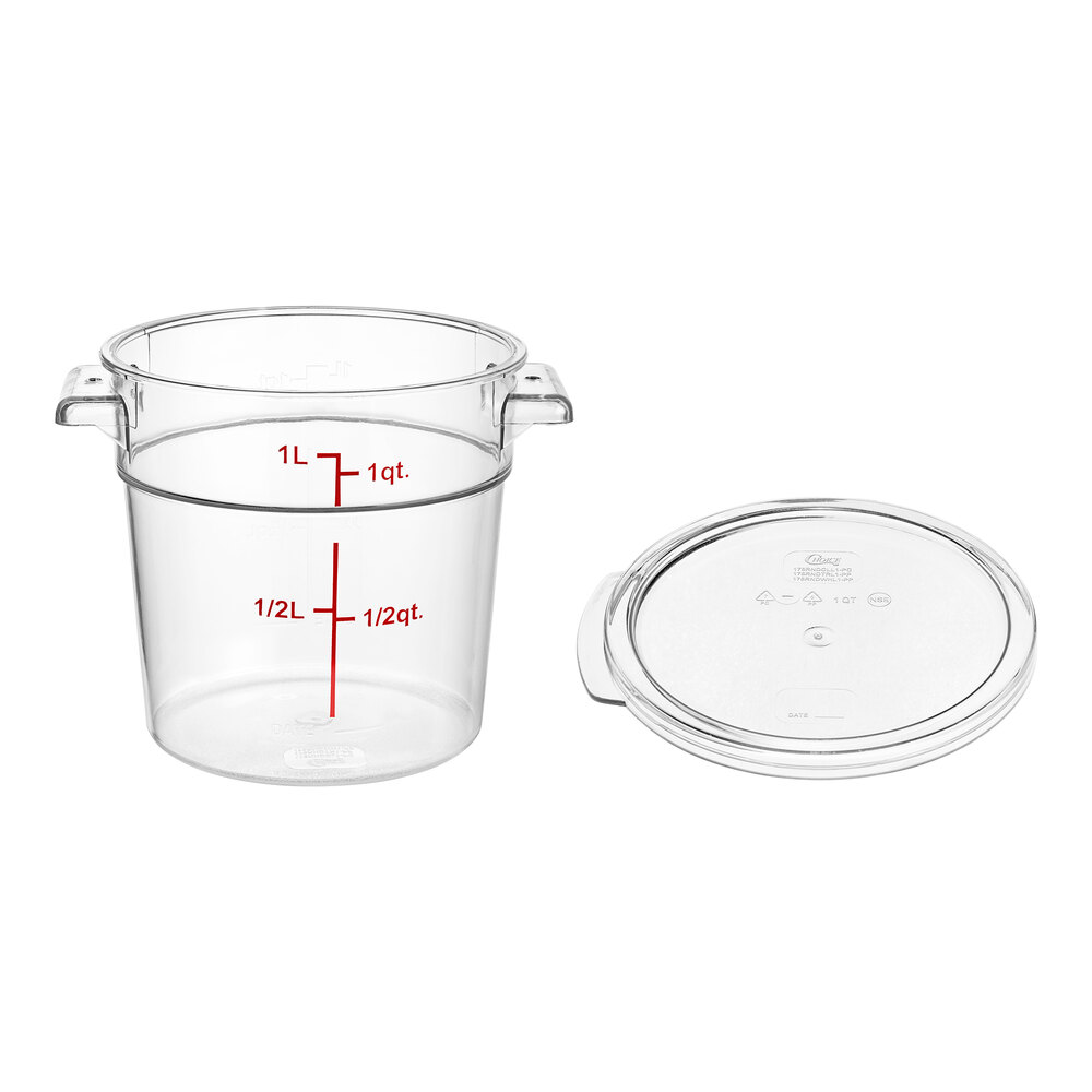 With a completely clear construction and versatile 1 qt. capacity, this container and lid make it easy to store ingredients, as well as fully prepared food. The lid keeps food fresher for longer than when covered with traditional foil or plastic wrap. This food storage container and lid are perfect for restaurants, caterers, delis, and cafes. Use them to store freshly-chopped fruit salad, sliced vegetables, soup stock, or stew.