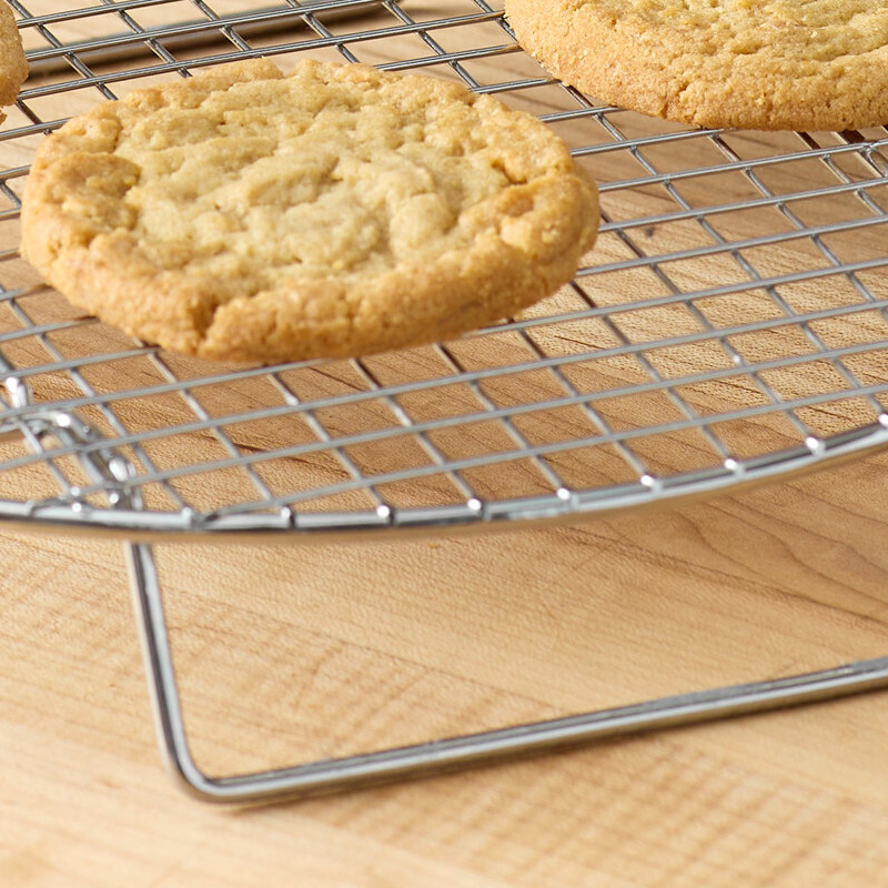 The Choice 10 1/2" Round Footed Chrome Plated Steel Cooling Rack is a great addition to my baking tools. Its sturdy construction and elevated design allow for efficient cooling of baked goods, ensuring they retain their shape and texture. I'm satisfied with this cooling rack, and it has been a valuable asset in my kitchen.