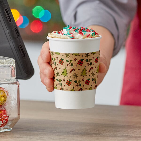 Enhance the holiday spirit at your coffee shop or cafe with the Choice 10-24 oz. holiday printed coffee cup sleeve!