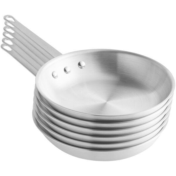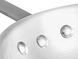 This aluminum frying pan is heavy and well made. If I grease it well, food doesn't stick to it. I use it to reheat the food and for making omelettes. The only negative is that handle gets hot if it stays on the stove for longer periods of time.