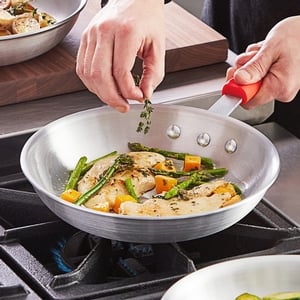Ideal for making low acidic foods such as mushrooms, broccoli, and cauliflower, this item features gently sloped sides that are perfect for turning, flipping, and removing delicious vegetable medleys from your pan. Its aluminum construction is also built for dependable use yet provides your kitchen with a lightweight, economical option that won't break the budget. Its red silicone handle even offers a comfortable grip that's heat-resistant up to 450 degrees Fahrenheit!