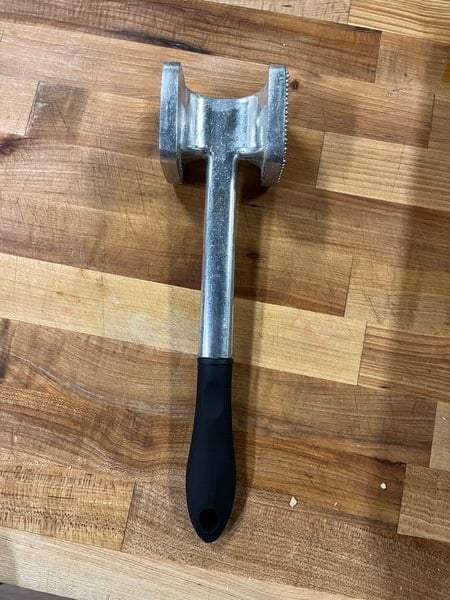 The product weighs a good amount and can easily flatten a chicken breast. The rubber handle doesn't feel 100% connected but rather just attached with a bolt of some sort as the handle seems to rock back and forth a little. Worried it may fall off in the future under normal use eventually.