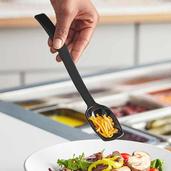 I like how light this polycarbonate spoon is it’s 10 inches long. Store is easily in the cabinet is perfect for sauce or condiments because it only holds about .75 ounces in the spoon it looks very nice even though the price point is inexpensive.